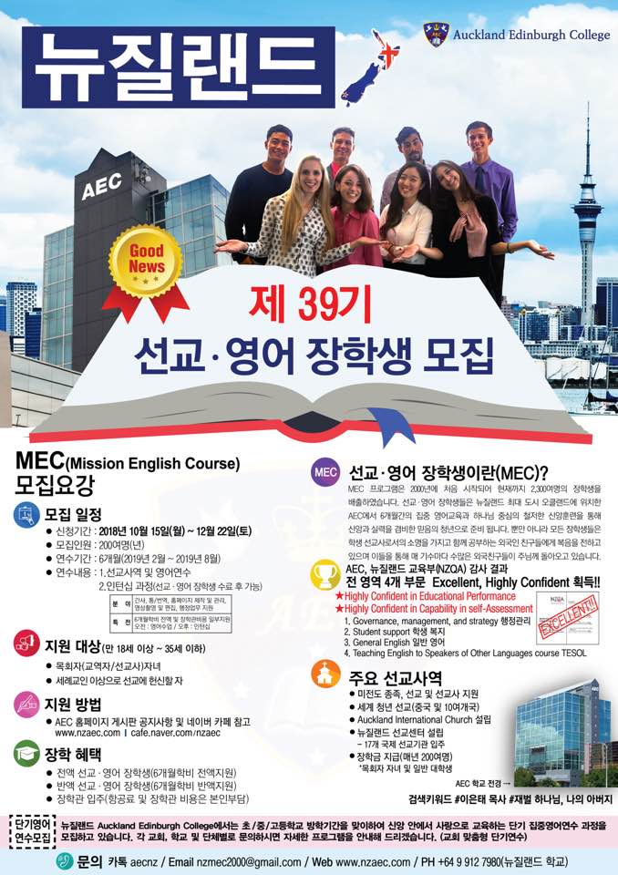 39기 뉴질랜드 선교장학생을 모집합니다!