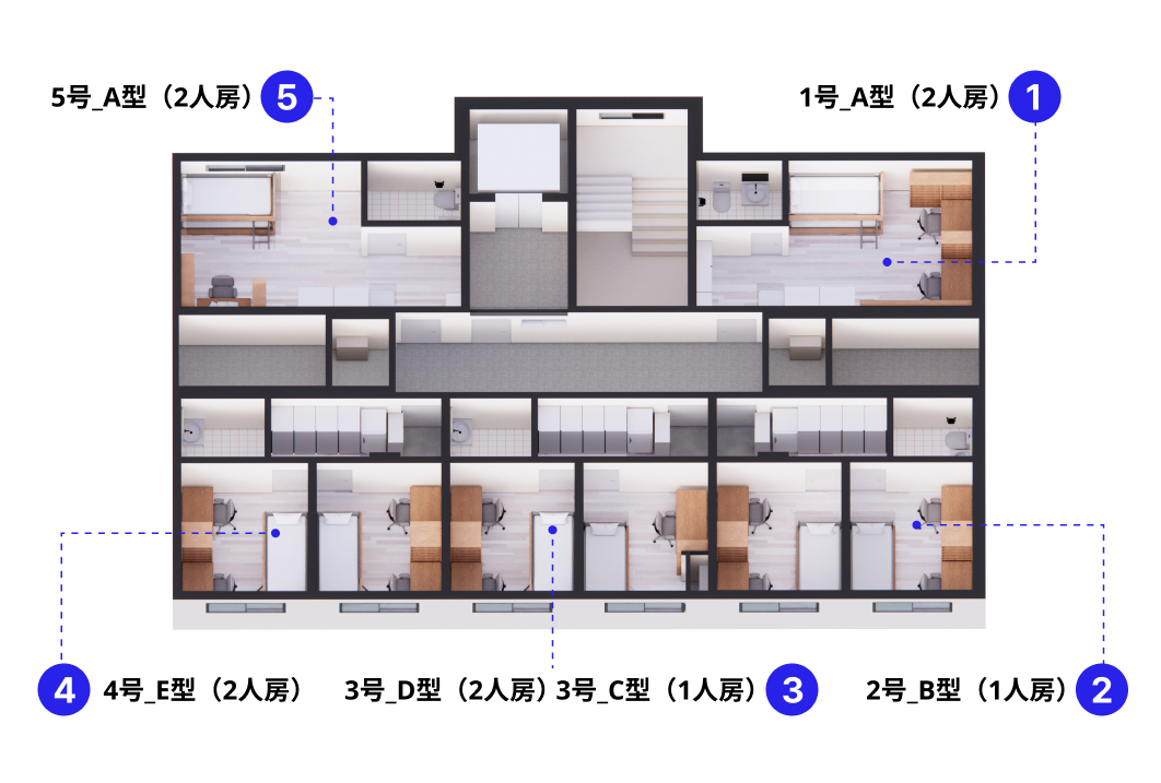 학생 기숙사 실 배치 현황 房间类型 户号 每户房间数量 每房间人数 卫生间(每户1个) 总房间数量 总容纳人数 共享人数 备注 A型 1号 A型 1房间 2人 2人 A型为单独使用1房间 16房间 32人 5号 A型 1房间 2人 2人 B型 2号 B型 2房间 1人 2人 B型共享2房间 16房间 16人 C型 3号 C型 1房间 + D型 1房间 1人 3人 C型1房间与D型1房间共享 8房间 8人 D型 2人 8房间 16人 E型 4号 E型 2房间 2人 4人 E型共享2房间 16房间 16房间 总计 64房间 104人